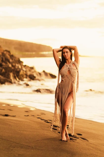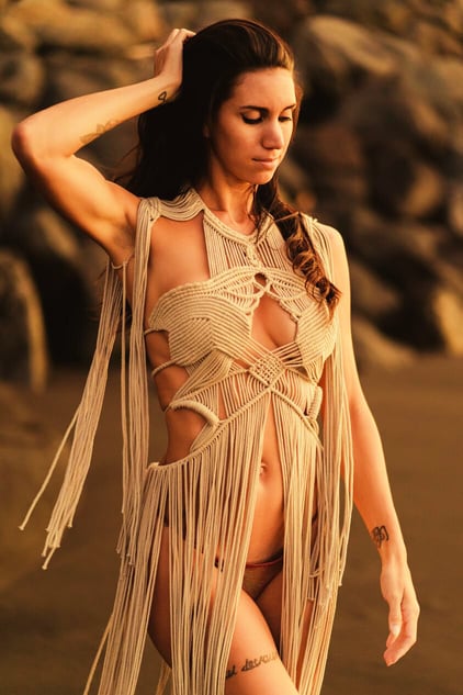 Les débuts de l'atelier ont été modestes, avec des suspensions pour plantes, mais rapidement, Aurélie s'est dépassée, portée par l'énergie que lui insufflait son petit bébé. De fil en aiguille, elle a réalisé des créations de plus en plus ambitieuses, passant d'une balançoire en macramé à des bijoux et des robes exceptionnels, aujourd'hui portés par des artistes. Installée à La Réunion, un lieu où l'artisanat occupe une place précieuse, Aurélie continue de faire grandir son atelier, créant des œuvres uniques qui reflètent la beauté et la richesse de son environnement insulaire.